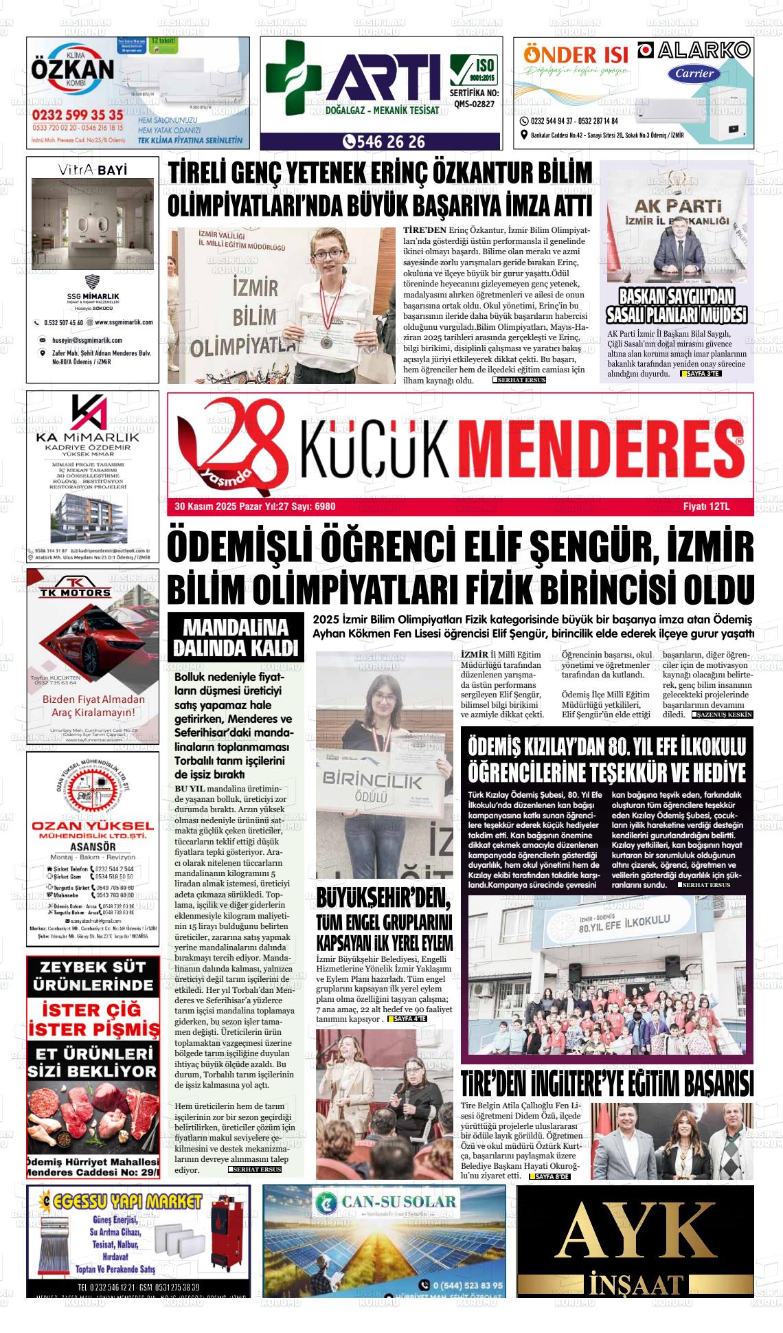 İzmİr Yerel Gazeteleri 30 Kasım 2025, Pazar Günü Manşeti